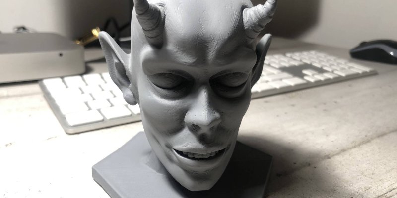 Une sculpture représentant une tête de diablotin (ou un korrigan) dans un style comics.