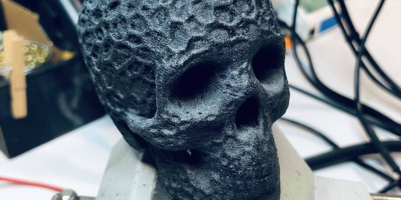 Un modèle 3D de crâne humain avec une surface composée de plusieurs couches d'un filtre de type Voronoï lui donnant un aspect organique.